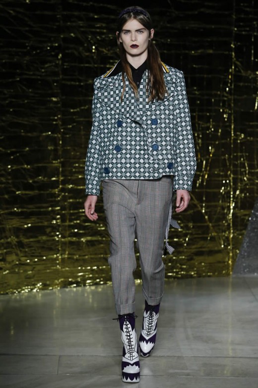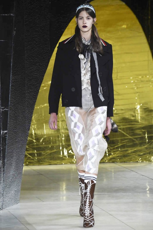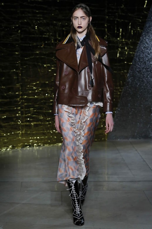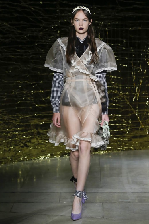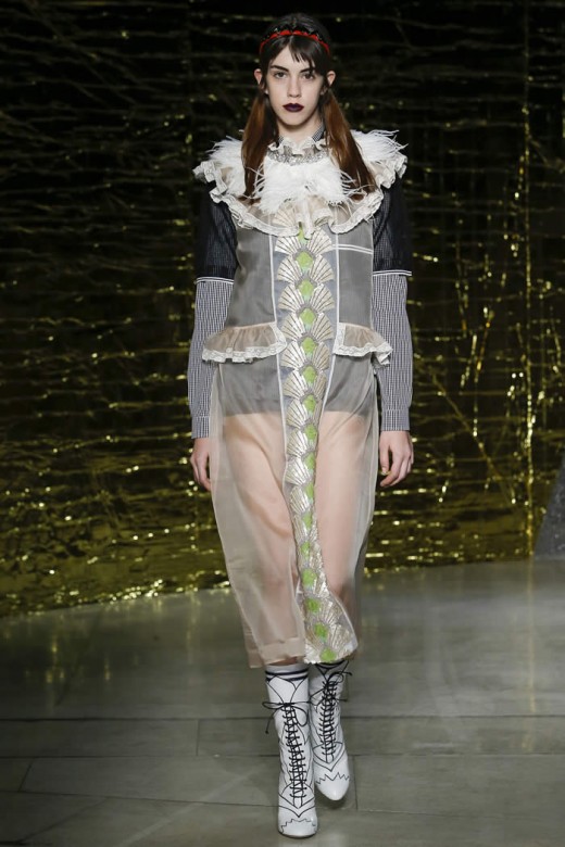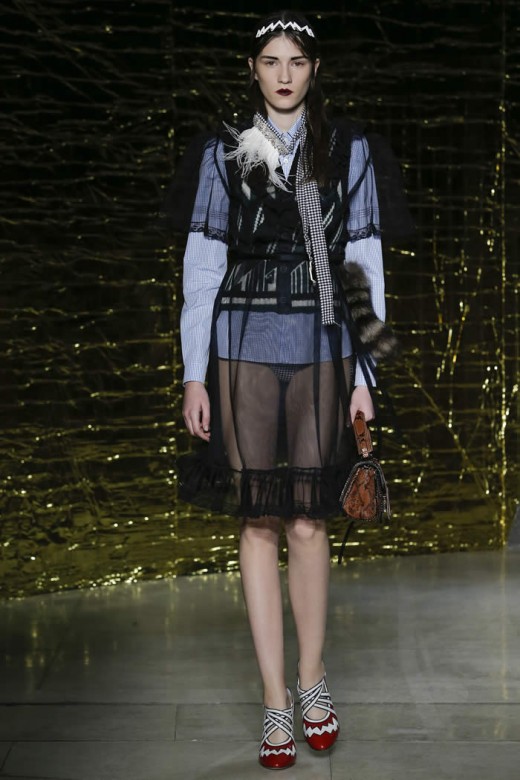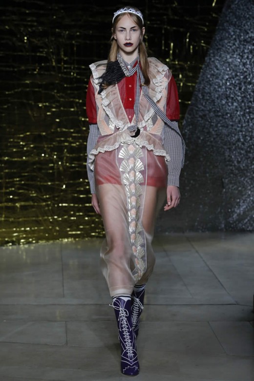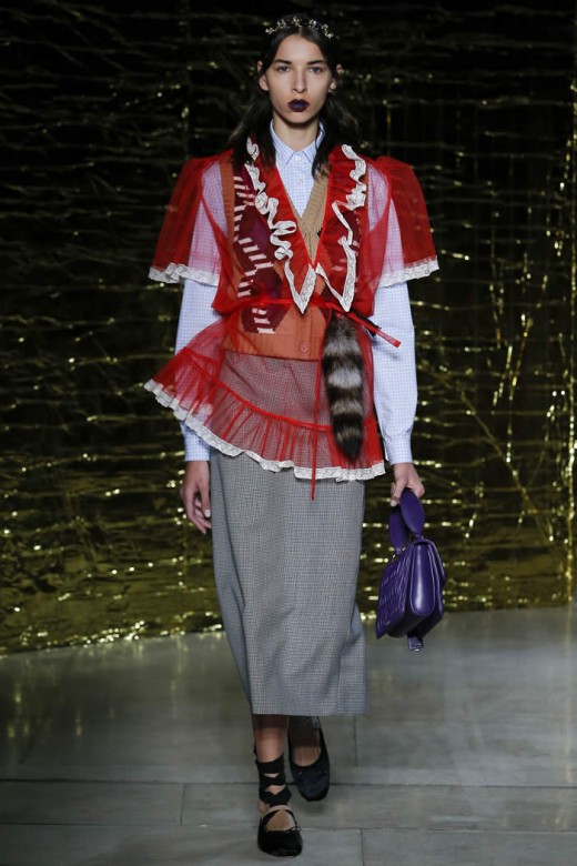 The red, short and boxy leather jacket has the diamond patterns, which are clashed with the turquoise skirts and it is added with raccoon fur tail. The sheet pretty baby nightgowns are looked cheap and they are layered with buttoned up shirts, leather coats and skirts. The dresses are added with the accessories and the shoes have colorful and sparkly platform & the bondage ballet flats with bevy straps. The clothes made the perfect sense of the fashion and modernization within the collection of the dresses.